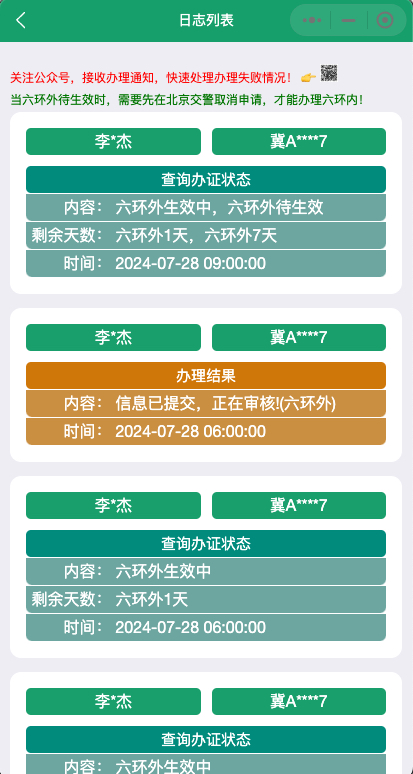 2、同时,您还可以点击【查看日志】按钮,随时查看车辆的有效天数、办理结果。